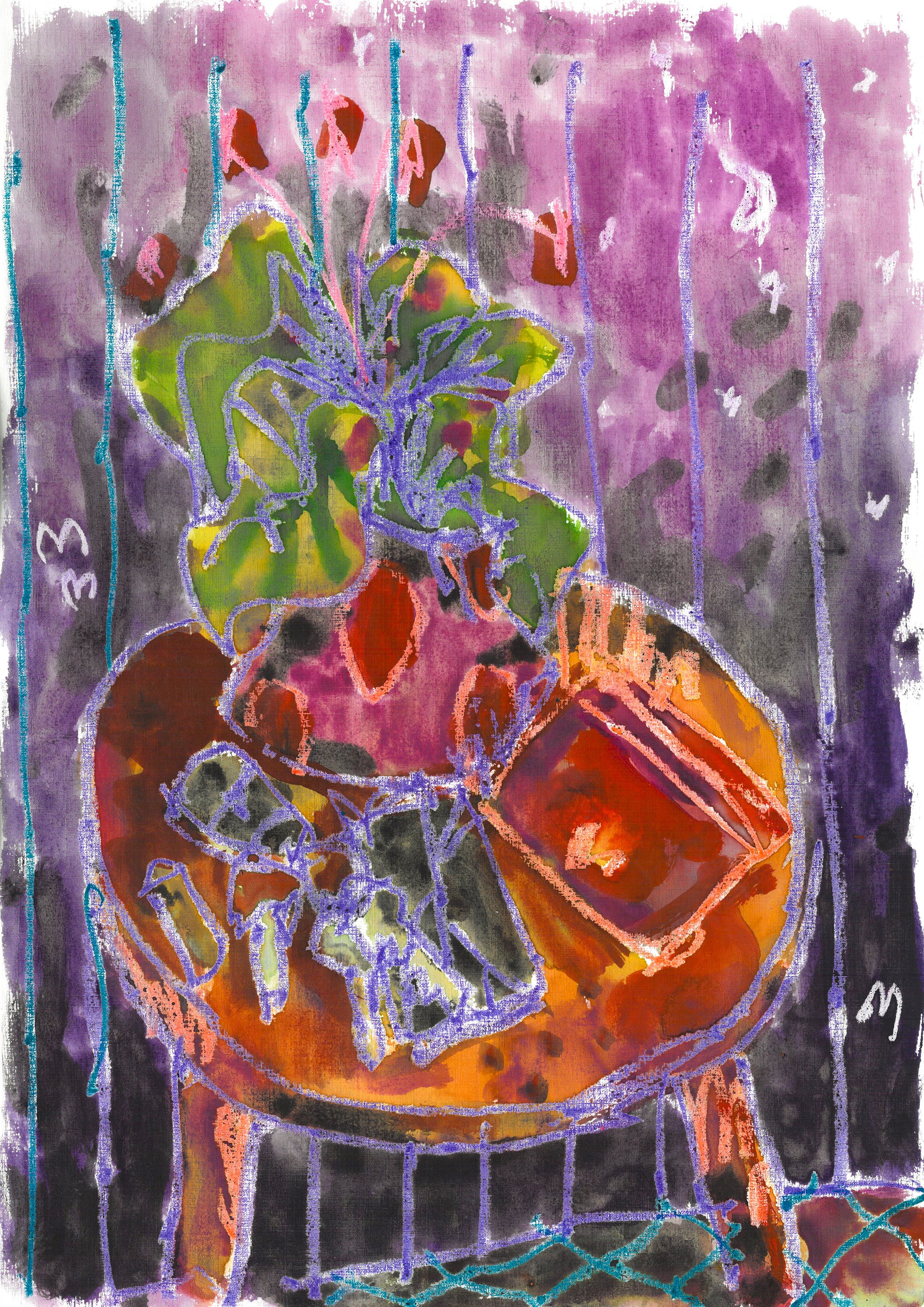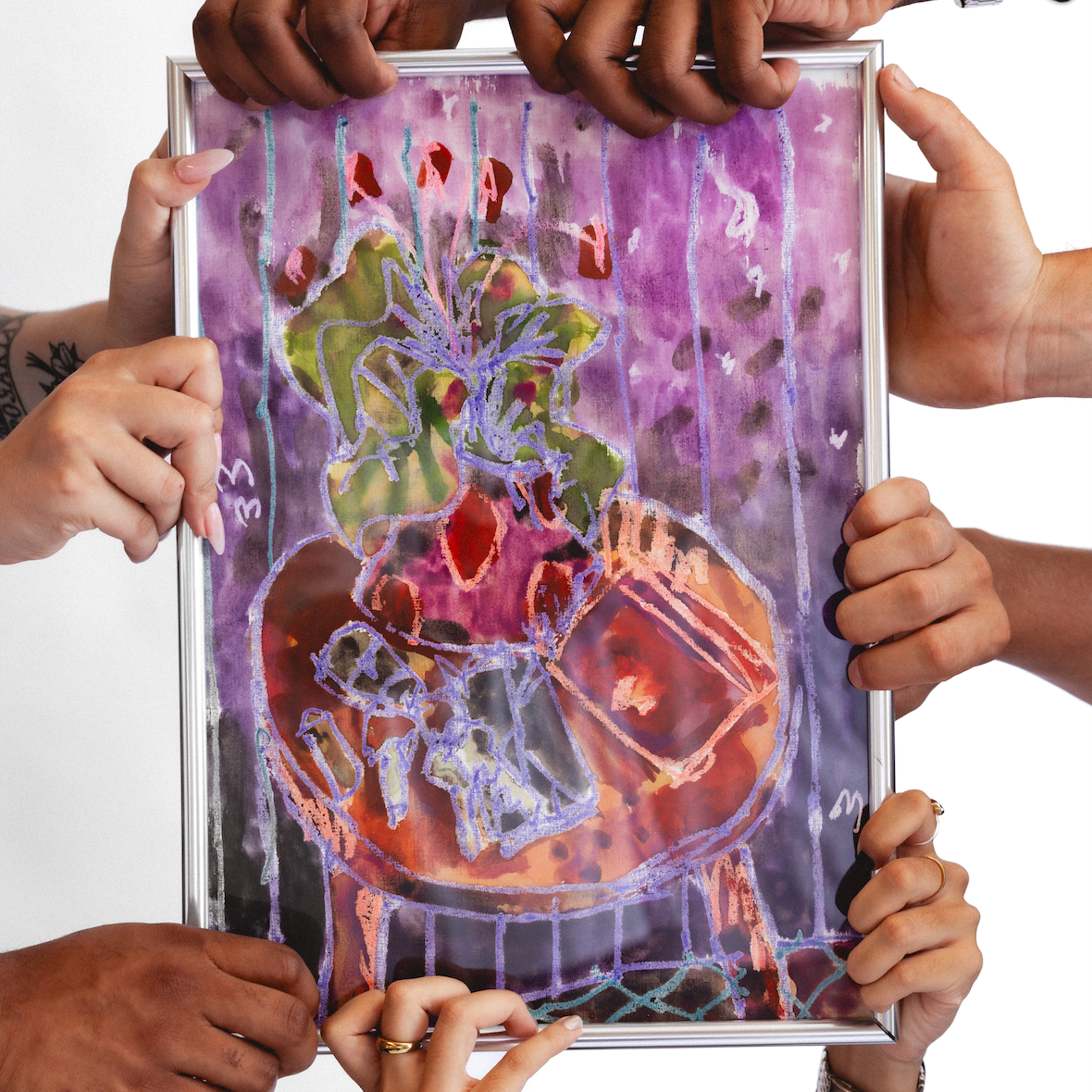 1/1 framed painting depicting a nightstand, the pace slowing, pockets emptied. keys, phone and a red dove cardholder being put to rest.